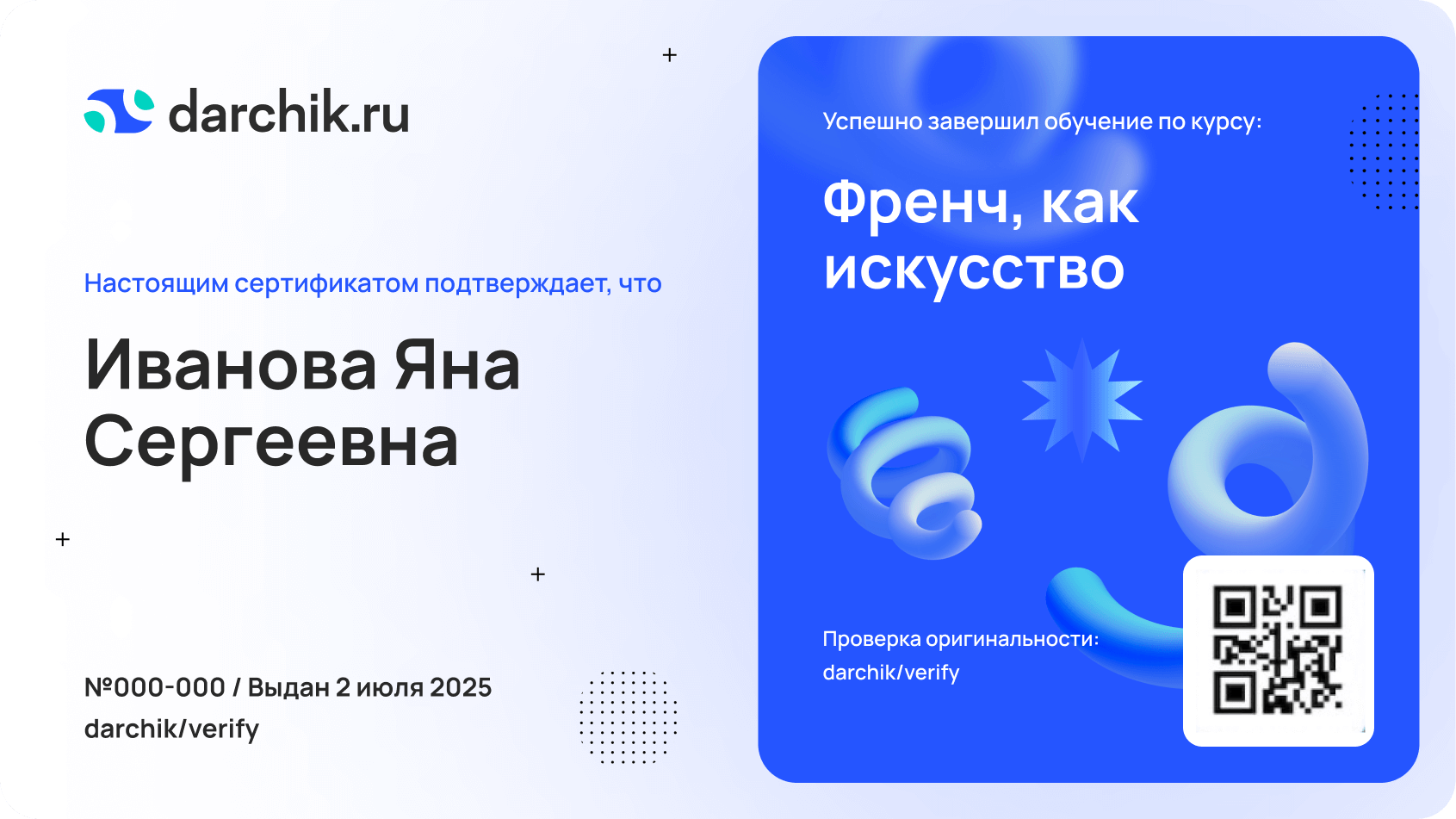 После завершения курса «Френч, как искусство» вы получите сертификат, подтверждающий ваше мастерство во французском маникюре. Обучение проходит дистанционно и доступно в любое удобное для вас время!