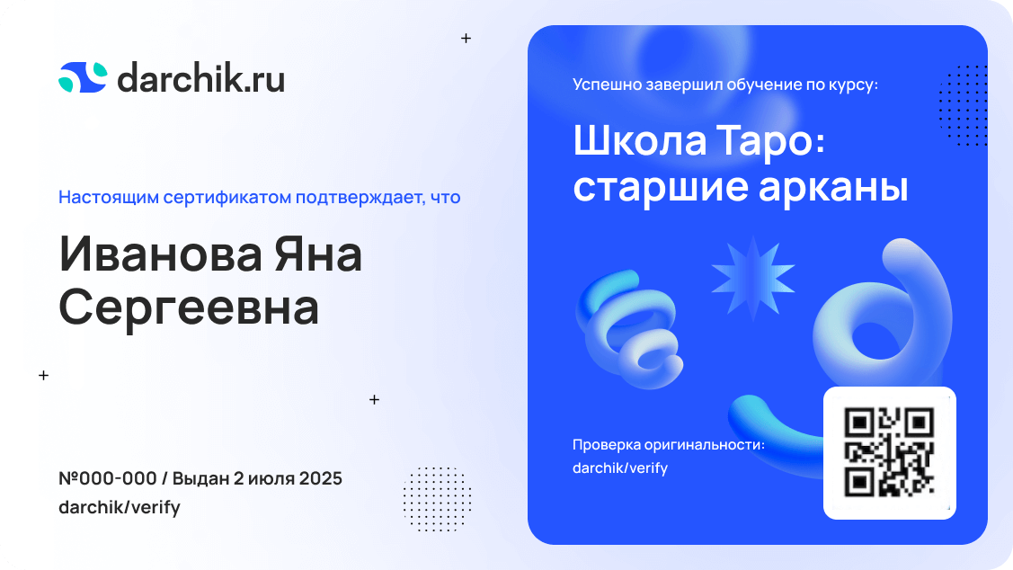 Сертификат курса по старшим арканам подтвердит ваши знания и умение глубоко анализировать ключевые архетипы Таро, раскрывая их значение в судьбе и личности человека