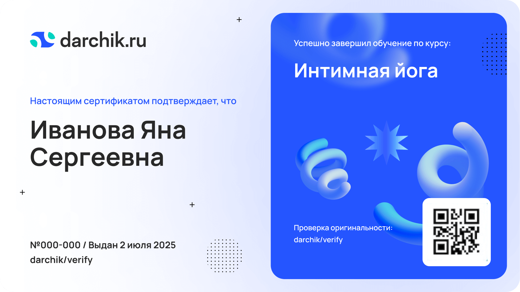 Пройдя курс, вы получите сертификат, подтверждающий освоение практик для укрепления интимных мышц и улучшения общего самочувствия. Занимайтесь в удобное время — доступ открыт 24/7