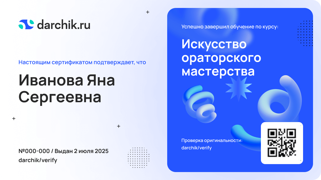 После курса вы получите сертификат, подтверждающий ваши новые навыки уверенного публичного выступления и работы с аудиторией. Отличное дополнение к резюме и повод для гордости!